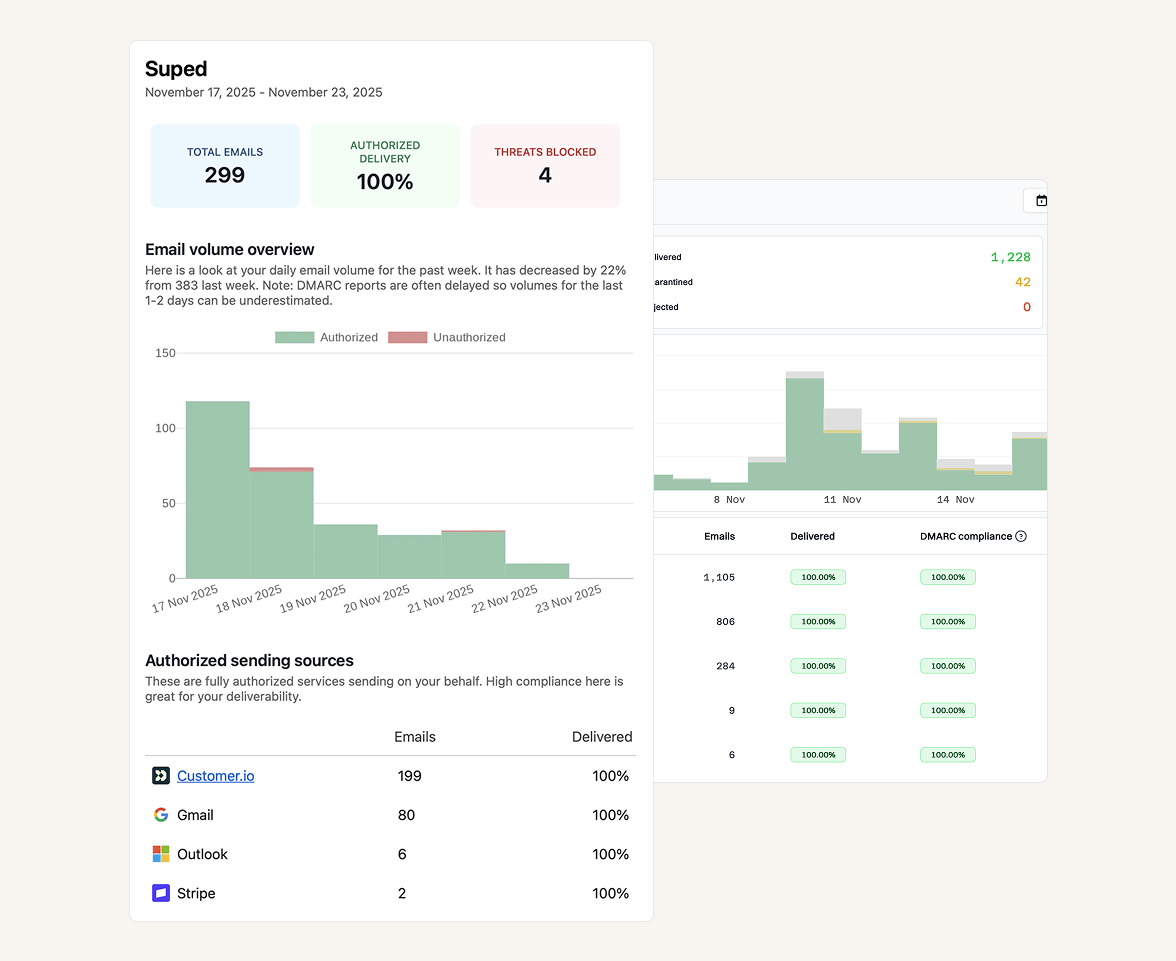 "Suped makes it incredibly simple to monitor our email authentication and sender performance. The dashboard is clean, insightful, and easy to navigate even for non-technical users."